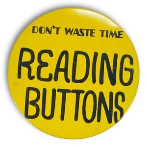 Don't waste time reading buttons, while spelled out on a button, forces the reader to engage by spending time reading the button. Although wasting time is subjective, the joke message is clear that the wearer has intended for the reader to be the brunt of a practical joke or gag.