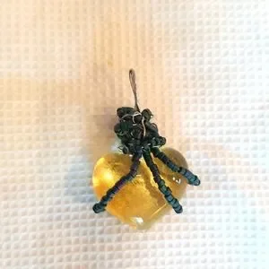 handmade yellow glass heart encircled with black and blue beads