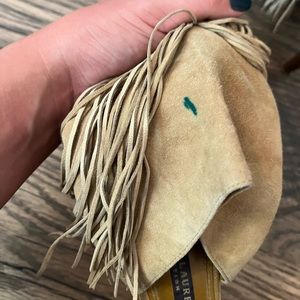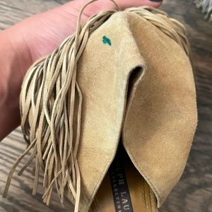 Lightly used RL Collection heels. Beautiful suede fringe. There is a small stain but it is covered by the fringe so it’s not visible when wearing the shoe. Size 9.5 fits TTS.