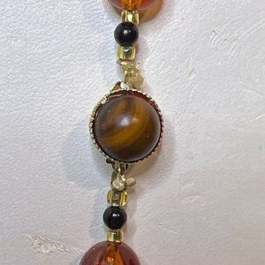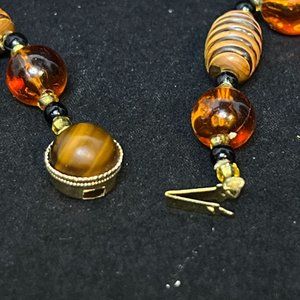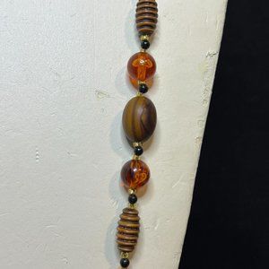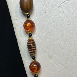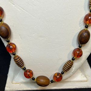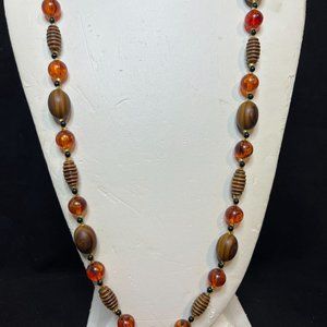 Vintage Single Strand Gold Tone Wooden & Orange Plastic Bead Necklace 33" (3893)
