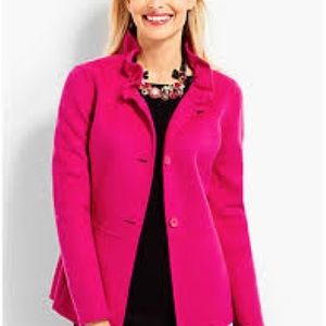 Whether your look is casual or refined, this is the piece your that wardrobe's been missing. A feminine ruffle collar frames the face and adds a nice flourish. The tailored fit features shapely seaming to create the ideal, double-face jacket.