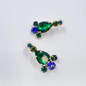 Green & Blue Tear Drop Rhinestone Costume Post Earrings. Earrings are 1 1/2” long by 7/8” wide and have some wear on them so please look at the pictures carefully. Earrings are previously loved and are in good condition.