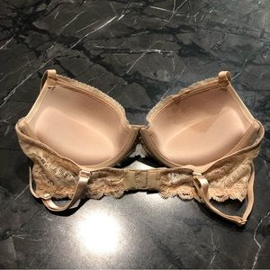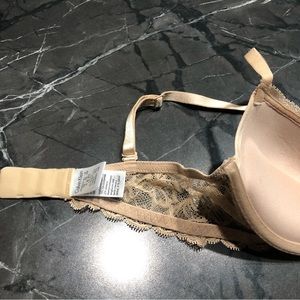 Calvin Klein Comfort Lace underwire bra with lifts, size 34B.This nude seamless contour bra has lace wings, fully adjustable straps and 3 columns, 2 rows of hook and eyes.Comes from a smoke-free home. Bought but didn’t fit