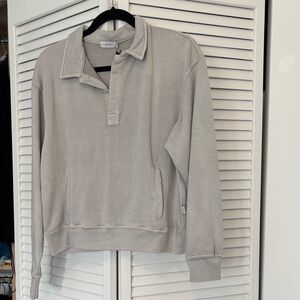 This is a beautiful sweater by Jaeger. It is a size medium but the neck is on the smaller size. Not for someone with a larger head or neck! The color is a pale butter yellow.