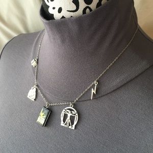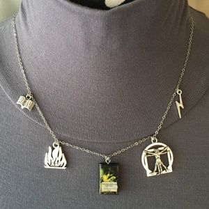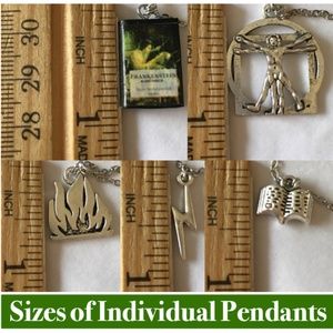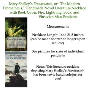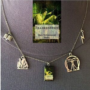 This necklace depicts Mary Shelley's Gothic novel Frankenstein, featuring (from left to right), a book charm, to represent the academic knowledge Victor Frankenstein and the monster gain, which falls short of preparing them for life. Next is a fire charm, which symbolizes the abilities of the mind to create and destroy, shown when the monster burns the cottage of the family he has been watching after they reject him, and also because of the subtitle, The Modern Prometheus. In the center is a Frankenstein book cover pendant. Then comes a Vitruvian Man, for the scientific secrets involving the creation of life Victor Frankenstein is so eager to discover. Last is a lightning pendant, which represents forces outside of human control, which is what brings the monster to life. This necklace is newly handmade, and is adjustable from 16 to 21.5 inches (can be made smaller/larger upon request).