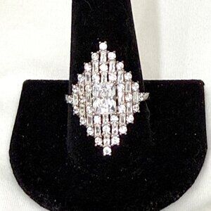 Vintage matte gold tone squiggle brooch. It measures approximately 3.25" x 1-1/8". The pin stem measures approximately 2/25" and secures with a rollover catch. Lots of different ways to wear this brooch, as it looks good vertically, horizontally or on a diagonal. Due to its size, probably best for a large lapel or a hat, maybe to close a scarf. Lots of options. The color is very good. Good pre-owned and vintage condition. Minimal to no signs of wear.