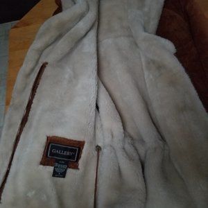 Medium saddle brown suede leather, faux shearling lining, draw string cinch back, zipper and spring latch closure. Small to medium size 10/12
