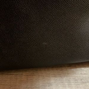 Like new, has one small stain on back (pictured), ware on the loop that the strap attaches to (pictured) - it is not very noticeable - tried to get the best photo I could - original strap, main area is very spacious