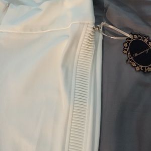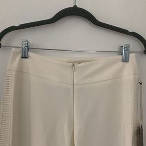 These are a nice pair of winter white pants. They are made of viscose, nylon and spandex. Have an invisible zipper with a nice touch of ribbed material from the waist band to the bottom of the leg. Add a festive top and you’re holiday ready!!!