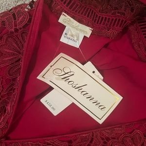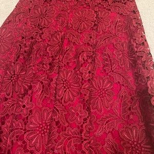 Gorgeous red lace dress. Short sleeves. Slight trumpet style flounce. Excellent condition, never worn. Approximately 43 inches from shoulder to hem.