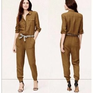 Ann Taylor LOFT Linen Blend Utility Mustard Yellow Roll Tab Sleeve Jumpsuit S