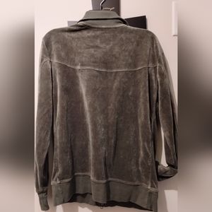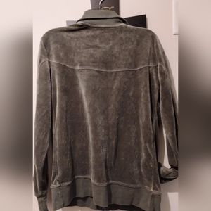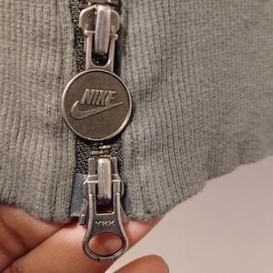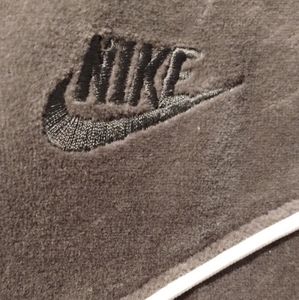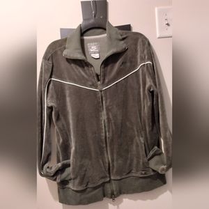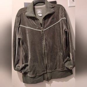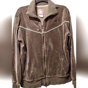 Women's Nike Sportswear Vintage Velour Jacket/ Sweater Velour, dark olive green with a white stripe, Double Zipper, Two Front Pocket, size XL, good condition just has two light spots and one light spot inside jacket near zipper, the lighter spot is on the inside and can be seen, as seen in last 3 photos