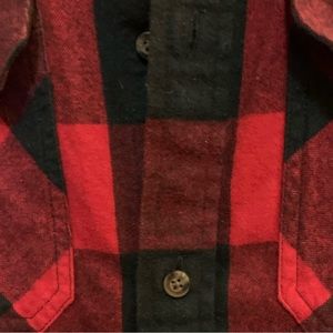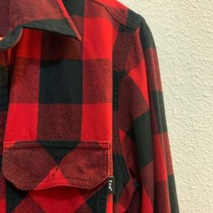This is a sherpa-lined shirt jacket with inseam pockets, patch pockets and dropped shoulders. The sleeves are insulated with a lightweight vegan fill for added warmth. It's made with cozy, brushed flannel.