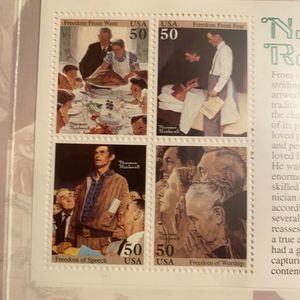 Issued on July 1, 1994 in Stockbridge, MA., this Souvenir Sheet of four 50 cent stamps honor Norman Rockwell centennial of his birth. On January 6, 1941, as World War II raged in Europe, President Franklin Delano Roosevelt addressed Congress. He submitted that any settlement reached after the war should be based upon "four freedoms": freedom of speech, freedom of worship, freedom from want, and freedom from fear. Norman Rockwell created four paintings, each titled after one of the freedoms, that visually idealize the concepts of Roosevelt's speech