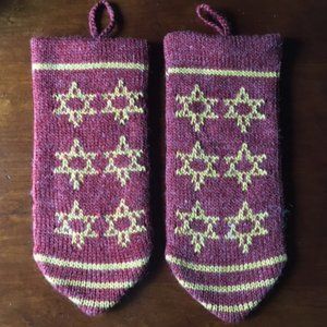 Vintage pair of hand-knitted Hanukkah stockings. Hand-knitted with acrylic or wool yarn; no labels; these are a brick/maroon-color with gold Stars of David and gold stripes. Have knitted hanging hooks, too.