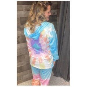 Our Woodstock Tie Dye Joggers Set is beyond cute and perfectly comfy. Swirls of tie dye in aqua, white, orange, pink, yellow and purple detail the soft & stretchy knit. The top features a V-neckline, hood with tie, long sleeves, side slits and a kangaroo pocket. The pants have an elastic waist with drawstring, an elastic cuff at the hem and a relaxed fit. This will be your go to set. You won't want to take it off!