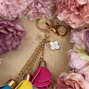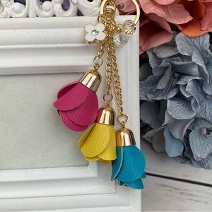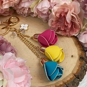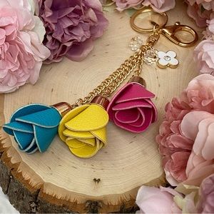 This beautiful keychain has three vegan leather roses, in blue, yellow, and pink. They dangle at different lengths from gold chains. At the top are crystal beads, and a flower charm.