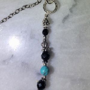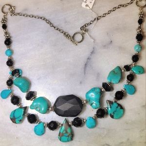 I hand crafted this 21 1/4" from genuine turquoise, onyx and sterling silver beads and clasp. I buy my clasps and many of the sterling pieces from a Thai co-op where the profits go to funding village services such as a school and micro-loans for village women who want to start businesses. This is a statement piece and will go with everything from jeans to gowns.
