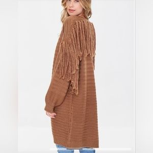 Forever 21 ribbed knit cardigan sweater featuring an open front, dropped shoulders, long peasant sleeves, tassel trim, and a slouchy relaxed silhouette.