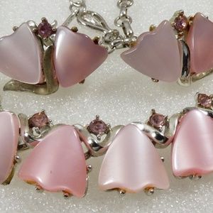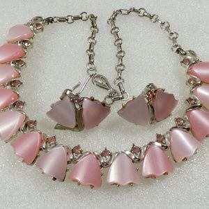 Vintage Coro Pink Thermoset Silver Tone Link Collar Necklace & Clip Earrings Set