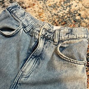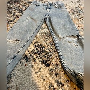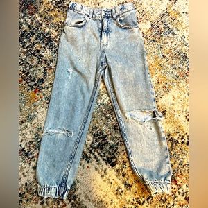 Pre-owned. Good condition. Pictures provided of any flaws/spot. Girls H&M ripped jogger jeans. Color: light denim. Size 8-9. Jogger style pants. Ripped jeans.