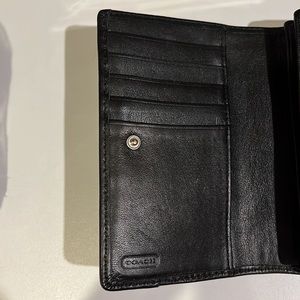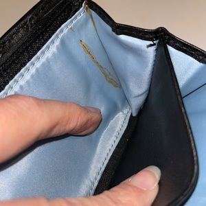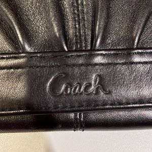 Coach genuine soft leather with baby blue fabric lining. Used twice as a clutch for a formal event. Lots of pockets. 5 credit card slots. One divided expanding compartment with zipper, original zipper pull (in tact)