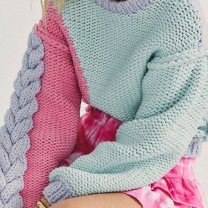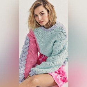 Slip on, a perfect transitional piece in color-blocked, chunky, cotton knit. This oversized sweater has a relaxed fit with a dropped shoulder and ribbed trim at the crewneck, wrist cuffs and bottom. A top-applied braid detail runs the length of the outer right sleeve.