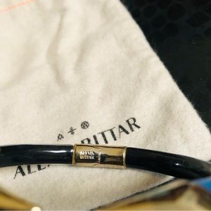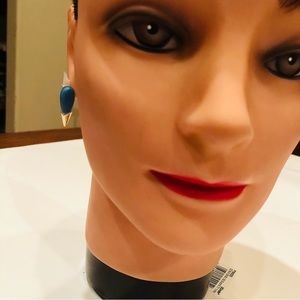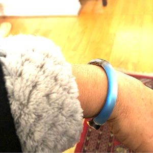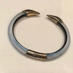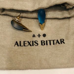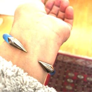 Never used, still in it’s original bag, Indigo Pyramid Brake Hinge Bracelet and indigo mirrored earrings, silver tone and each one comes with its own dust bag. Willing to sell them separately