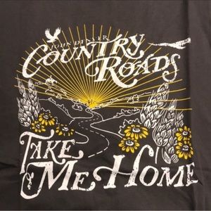 Graphic John Denver Country Roads graphic tee in white and golden yellow on a charcoal t-shirt. Thicker stretch cotton material blend. T-shirt does not have any ripped distressing along neckline or sleeves.