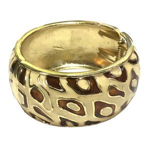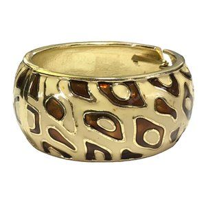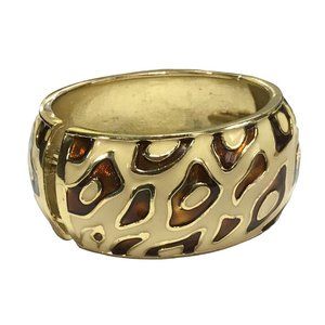 Wide Chunky Cheetah Skin in Brown and Ivory Enamel on Gold Tone Metal Clamper Bracelet.
