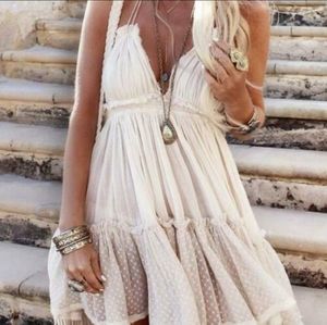 New Boho Flirty Tulle Dot Ruffle Halter Mini Dress Off White Cream Ivory