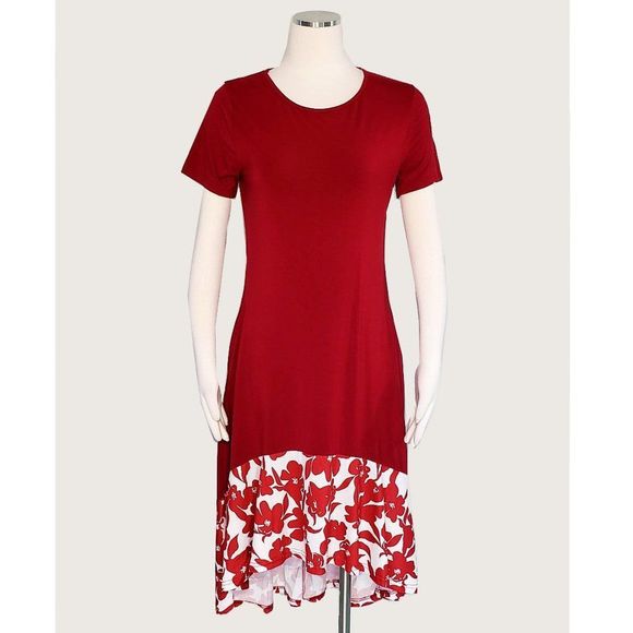 High-Low Maxi Dress. Polyester-Spandex Blend - Size S. Measurements: Front from top of shoulder seam 39"/Back 48"/Pit to Pit 17". Small discoloration shown in last picture. Otherwise in great condition.The dress has two pockets. There is some stretch to the material. The bottom panel is not stretchable. Length measurements are approximate.