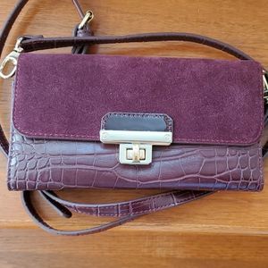 Lovely crossbody bag. Beautiful color.Suede front flap.Body faux alligator print.Goes w/everything. Inside holds ID, 6 CC slots, coin case, bill case.Shoulder strap may be removed to use as a clutch.Gold metal accents.