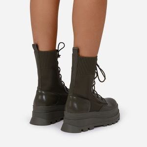 We have some serious boot envy with these new season boots doll. Featuring a khaki faux leather material, with a chunky platform sole, a knitted lace up design and an ankle length. Price is final!