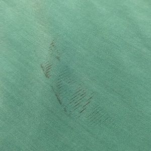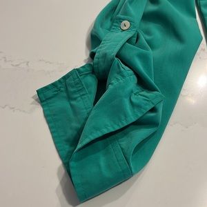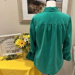 Chico's LS Green Button Up V-neck Blouse, Chico's Size 1 (8). Blouse features 2 faux front pockets and sleeves can be rolled and buttoned with attached strap. Please see last pic for a small blemish on the blouse. This is on the back of the blouse near the bottom right hand side. (2318)