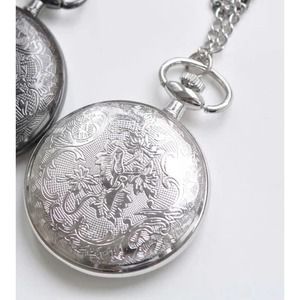 This watch is a rare blend of vintage charm and modern elegance. The polished silverfinish watch features a striking engraved design of roman numbers along the edge and an ice white face featuring black roman numerals. The matching chain that allows you to wear it as a necklace, or slip it into a pocket.