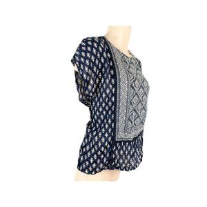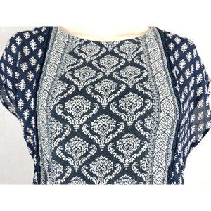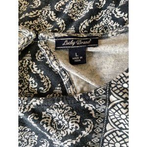 Women's Lucky Brand dark navy and white multipattern top, size large. No care/material tag, but feels lighter weight. Has a button that closes in back of the neckline. It's sleeveless, but seems to cover the shoulders. Measurements (lying flat across the front): * Chest (armpit to armpit) - 22.5" * Length (top of the collarbone to hem) - 22" (at shortest point in front) * Comes from a clean, smoke-free, pet-free environment. * Color variations may occur due to the flash of my camera, and/or lighting.