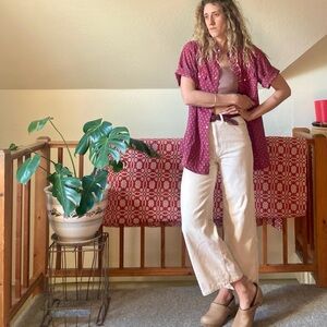 Love vintage denim chore coat by St. John’s Bay. Perfect fading, blue flannel lining and brown corduroy collar and cuffs. There’s a hole in the lining above brand tag inside and some mismatched buttons. Great condition overall! Tagged size M petite and arms are on the shorter size.