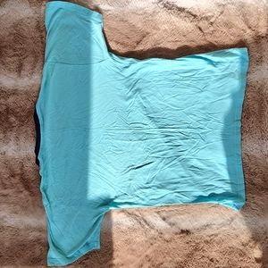This is a small shirt by GJC. It is a ocean blue with a navy blue collar. It has words and graphics on the front that are slightly cracked. It has no flaws besides the cracking.