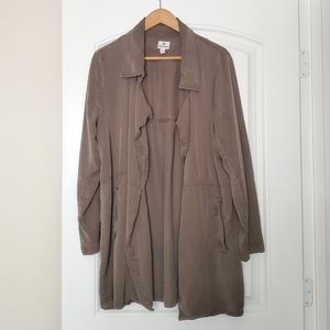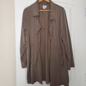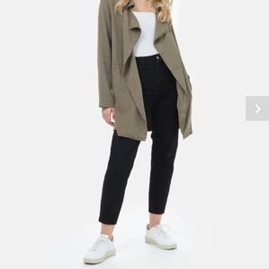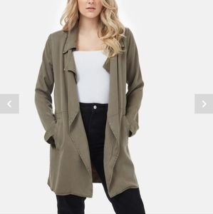 Women's Echo lightweight 100% tencel mid-length trench style jacket in olive night green. Two pockets. Sustainably made in China by fair trade brand Tentree. Very gently worn and in excellent condition.