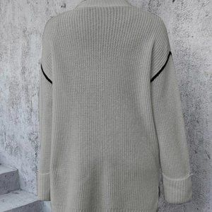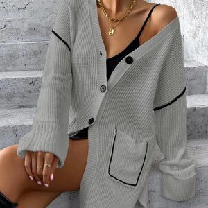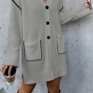 Grey Casual Womens Double Pocket Drop Shoulder Slit Hem Cardigan