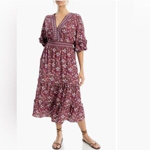 Calf-length dress in woven viscose fabric with flounce-trimmed V-neck and wrapover front. Dropped shoulders, long, wide sleeves, cuffs with narrow, covered elastic. Concealed, elasticized seam at waist with a removable tie belt. Unlined.