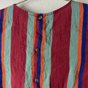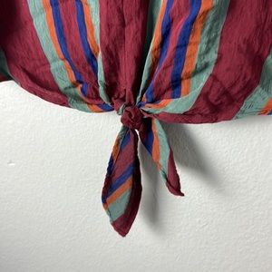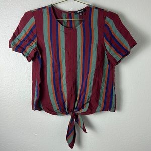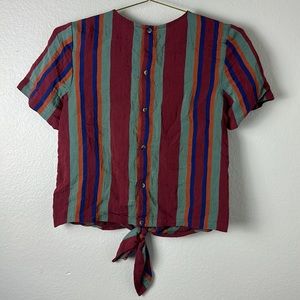 A tie-front top with buttons all the way down the back for your basic "party in front, party in back" situation. In bold stripes, this drapey shirt is an office-friendly option as easy to toss on as a tee.