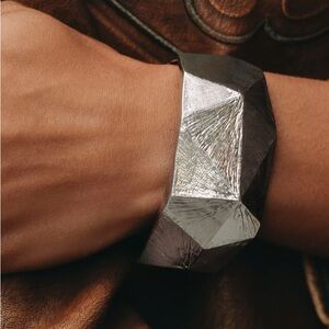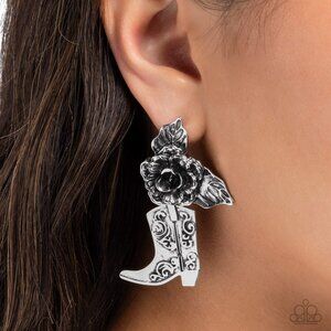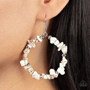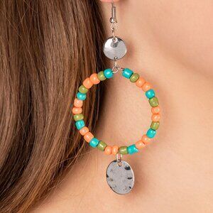 Stamped in floral and triangular glyph-like patterns, a flat silver hoop is adorned with refreshing orange stone accents for an earthy pop of color. Earring attaches to a standard fishhook fitting.