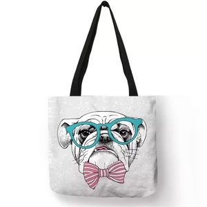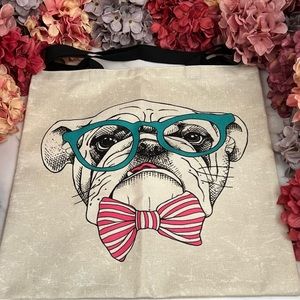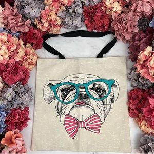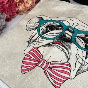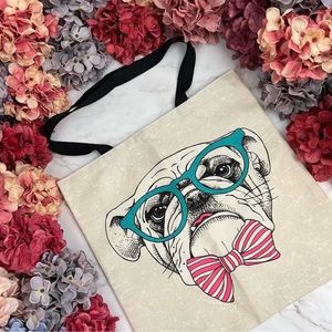 This lightweight eco friendly tote has a very preppy and studious English Bulldog drawn in black and white, wearing teal blue glasses and a pink and white striped bow tie. In traditional Bulldog style, you can see teeth peaking out over his lips.