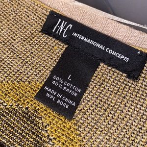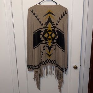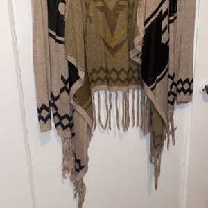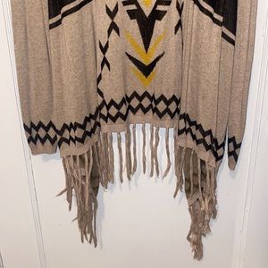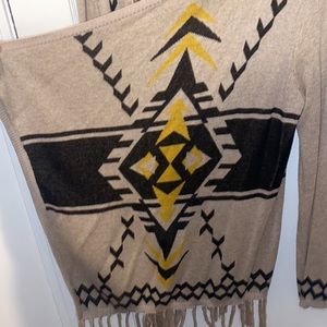 INC International Aztec open cardigan sweater. Long fringe on the bottoms. Tan/light brown color with yellow design. Size large. Used but in great condition, a small snag is shown in last pic on shoulder. 9
