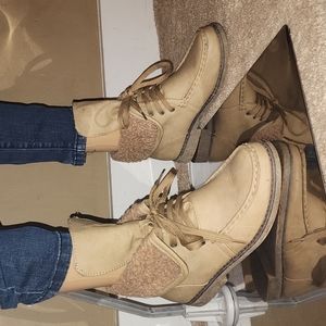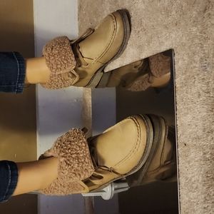 Tan convertible boots. Fold down for faux fur ankle boots and unfold for combat boots.