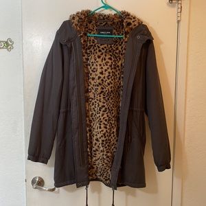 Dark grey Obey coat w/ cheetah fur lining inside & hood. Features cinch waist & bottom