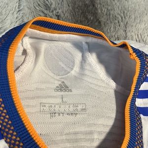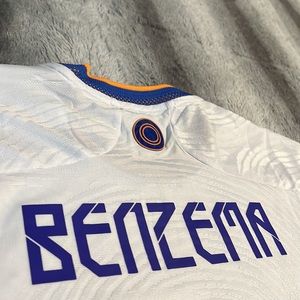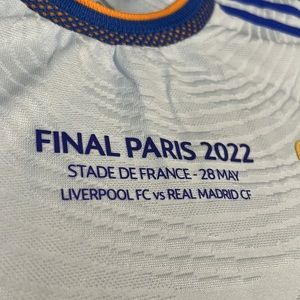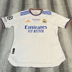 The home jersey player edition for 2022 UEFA Champions League winners is in NWOT condition other than the slight wear on the inner size tag (see photos)! It is made with Adidas’ authentic Heat.Rdy fabric technology! Has “Final Paris 2022” tag on the front like as worn in that 2022 final in Paris, and has 9 Benzema on the back! Size is labeled large but due to right fit of player jerseys, it fits more like an adult medium! Feel free to make a reasonable offer or add to your bundle!