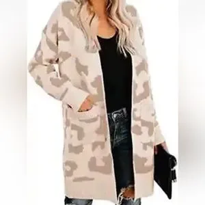Soulomelody Leopard Print Womens Tan Open Front with Pockets Cardigan Large Sweater Like New. Machine Washed once on delicate, hung to dry in EUC.